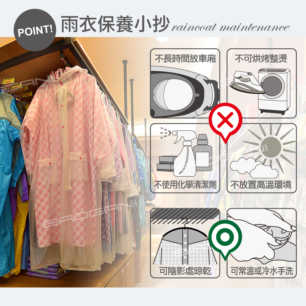 雨衣可常溫或冷水手洗,不要使用化學清潔劑,不要用機器脫水與烘乾,洗完後自然陰乾即可。