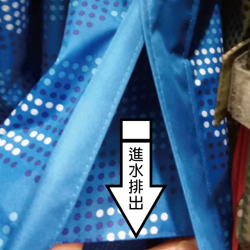 站立時,水會從排水槽排出,但因騎車時身體呈現L型,在肚子會形成一個缽接水,只要是市售的雨衣都會遇到這個問題,可以停紅綠燈時,站起身或拉一下,讓水排出即可。