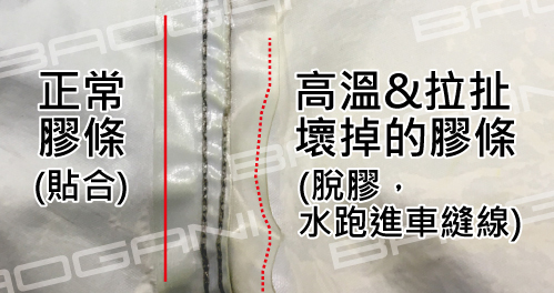 雨衣縫線有防水膠條,膠條遇到高溫會縮捲或大力拉扯造成脫落,雨衣就壞了。在正常保養使用下,非PU膠條的雨衣可用約3-4年的壽命,兩件式無防水效果時,可轉為風衣外套使用。