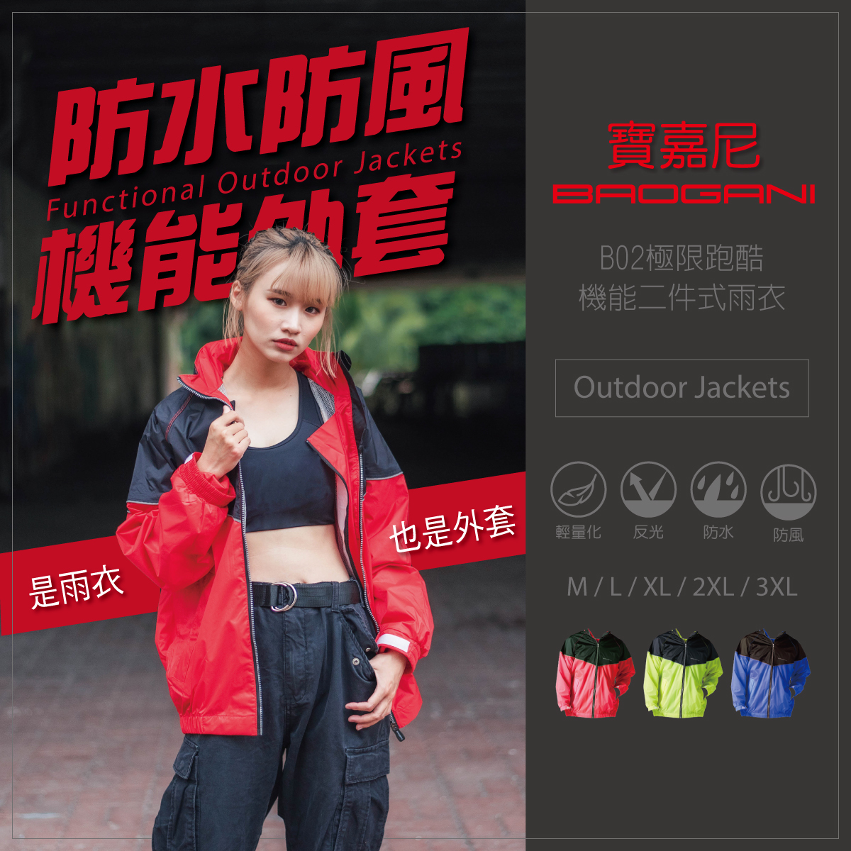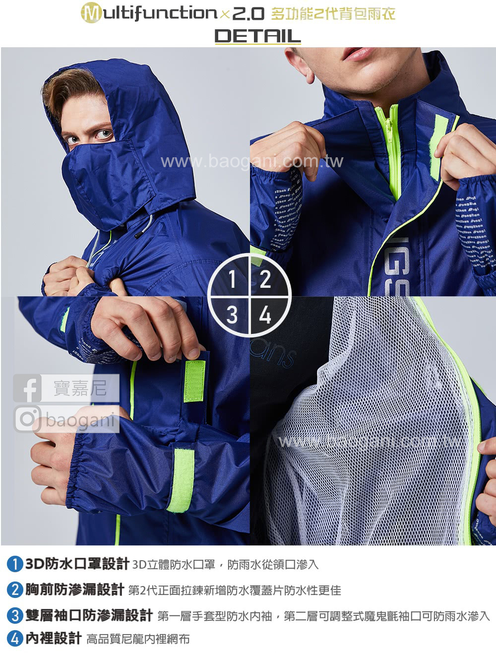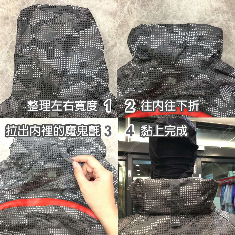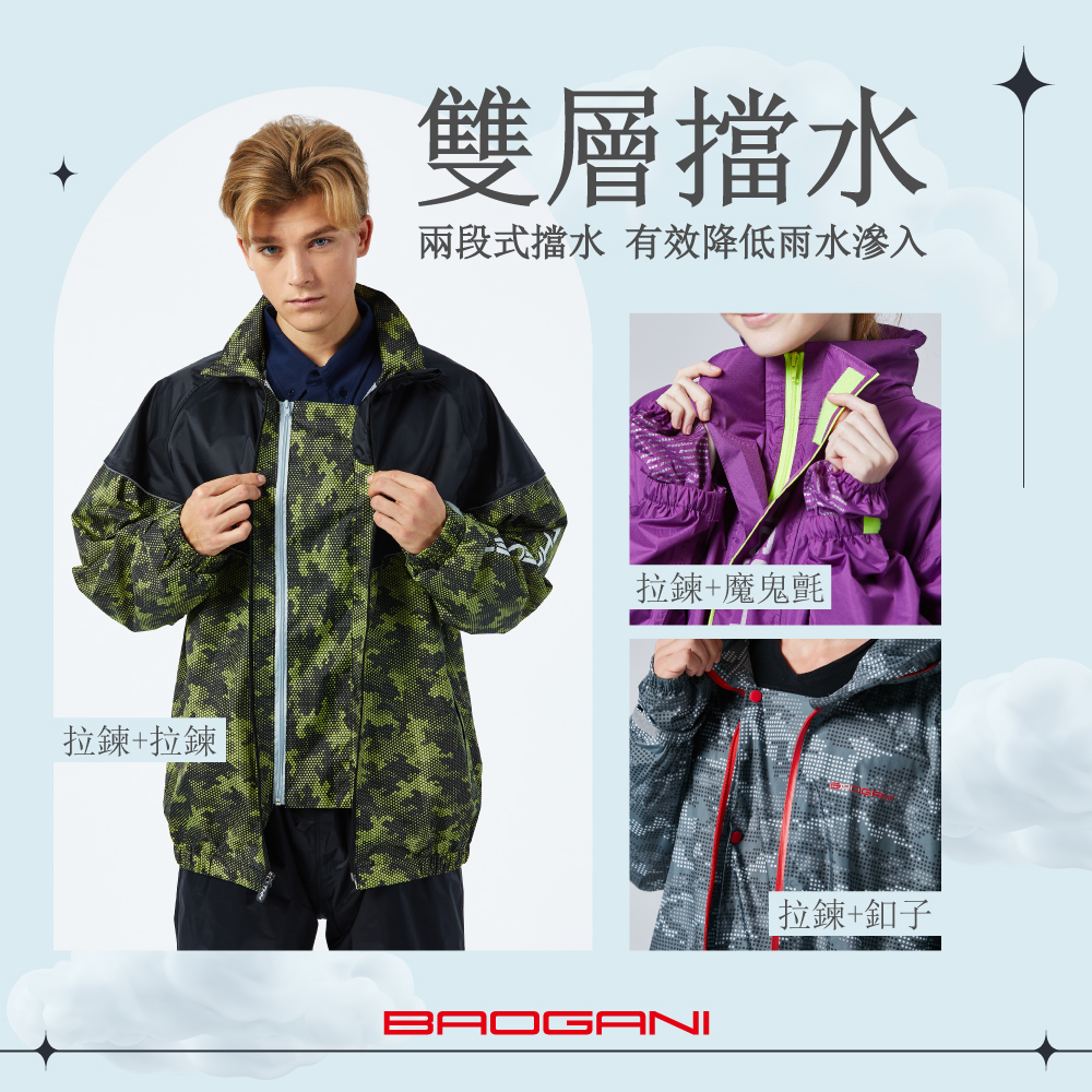 兩段式設計,可有效阻擋雨水滲入。各位朋友在穿著時,要記得內外都用上哦。