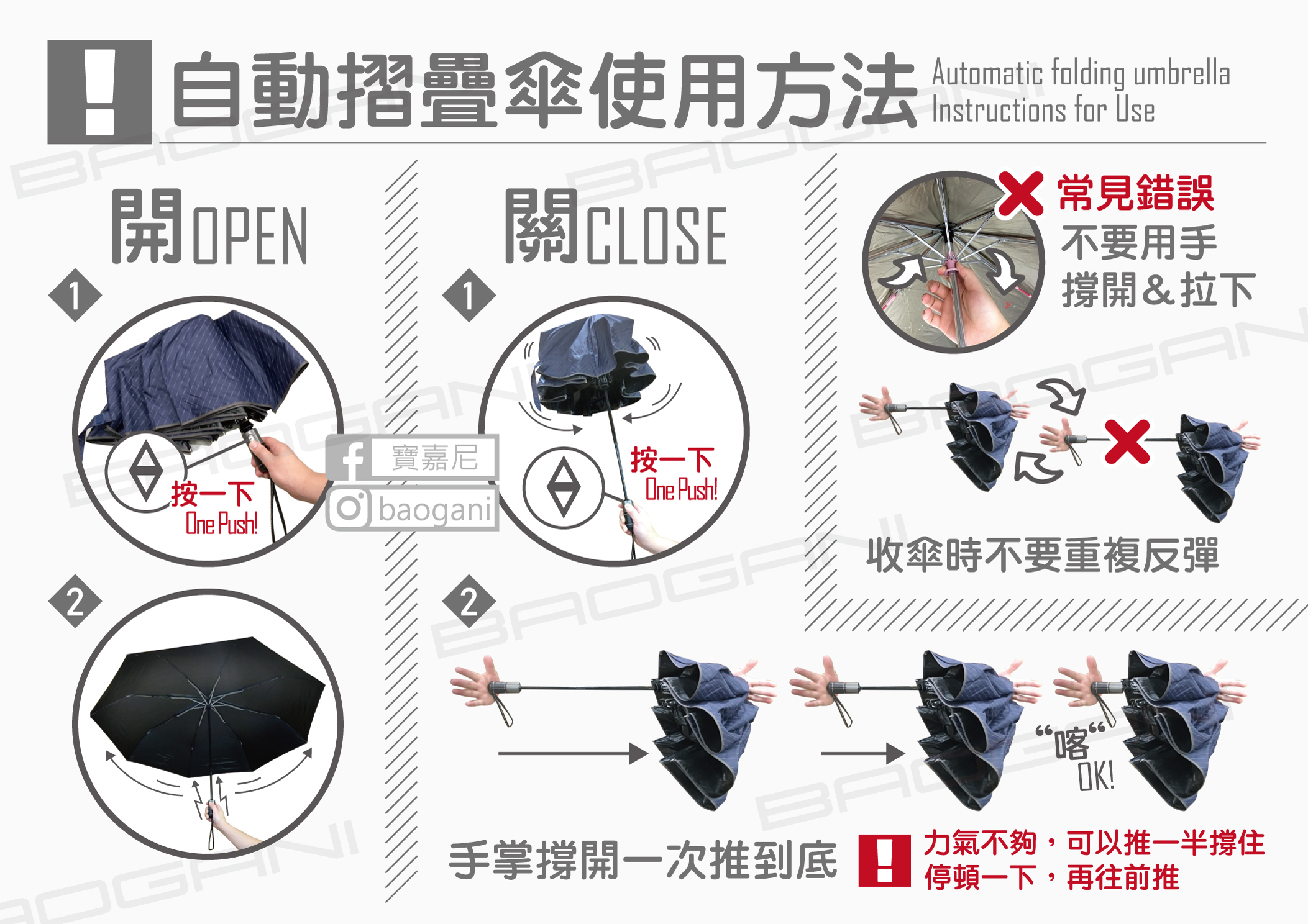 要留意自動傘使用方式,若自行以手拉方式收合,可能導致損壞。