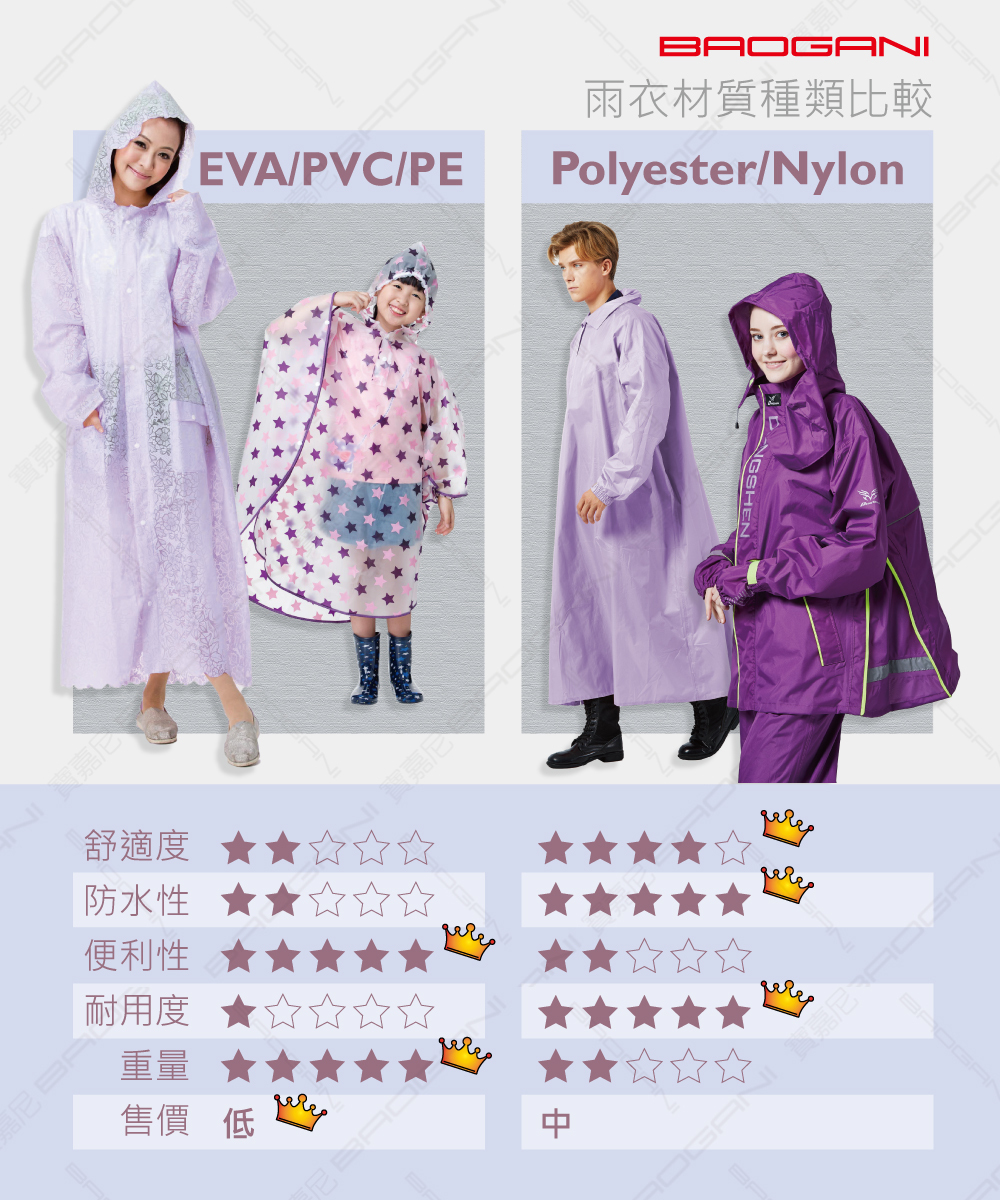 1.塑膠類(EVA/PVC/PE) 果凍狀半透明雨衣、輕便雨衣都屬這類。