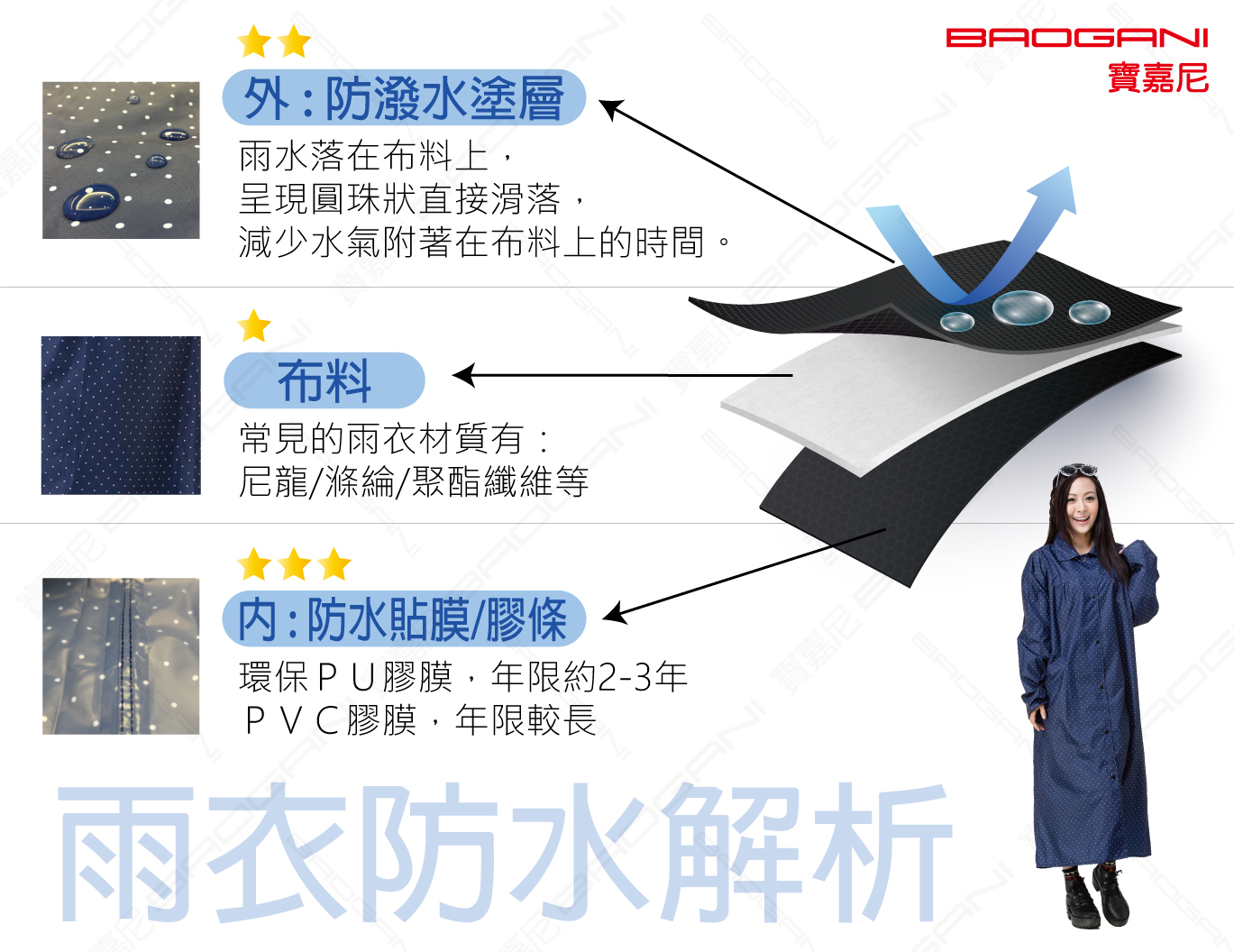 雨衣材質:常見有尼龍/滌綸/聚酯纖維等,在防水上較無影響。